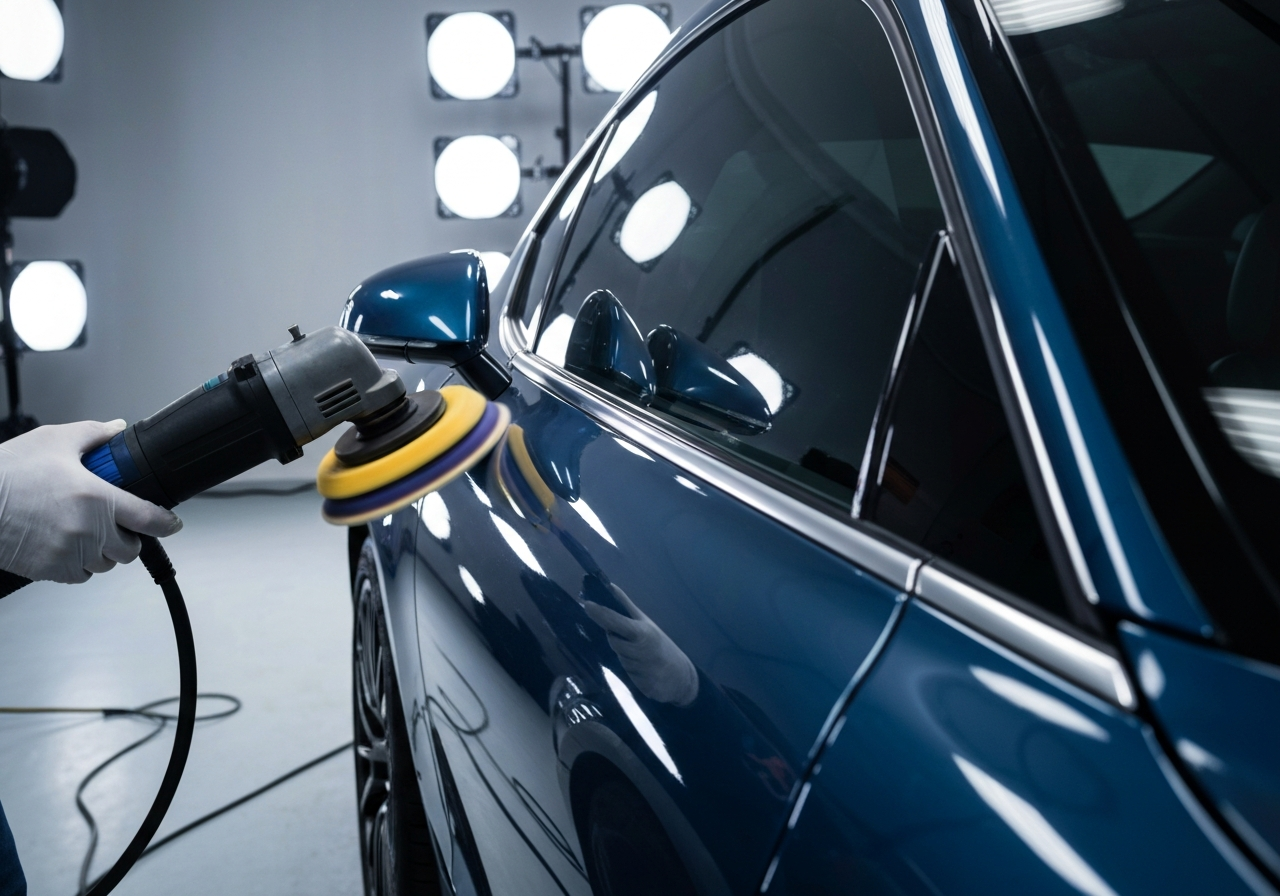 Pulido con máquina orbital bajo luz de inspección. Cada micro-rayón eliminado.